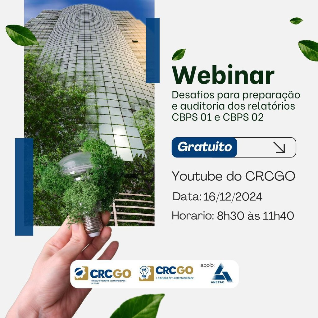 O CRCGO, por meio da sua Comissão de Sustentabilidade, convida os profissionais da contabilidade e áreas afins para o webinar "Desafios para a Preparação e Auditoria dos Relatórios CBPS 01 e CBPS 02". Não perca essa oportunidade e aproveite para se atualizar com especialistas renomados!
